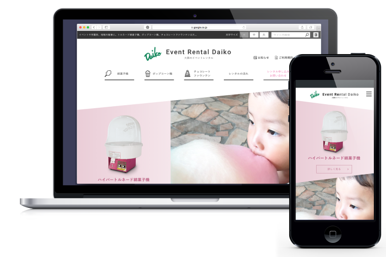 イベントや学園祭、地域の催事に。トルネード綿菓子機、ポップコーン機、チョコレートファウンテンなどイベントレンタル業様のサイトを制作しました。