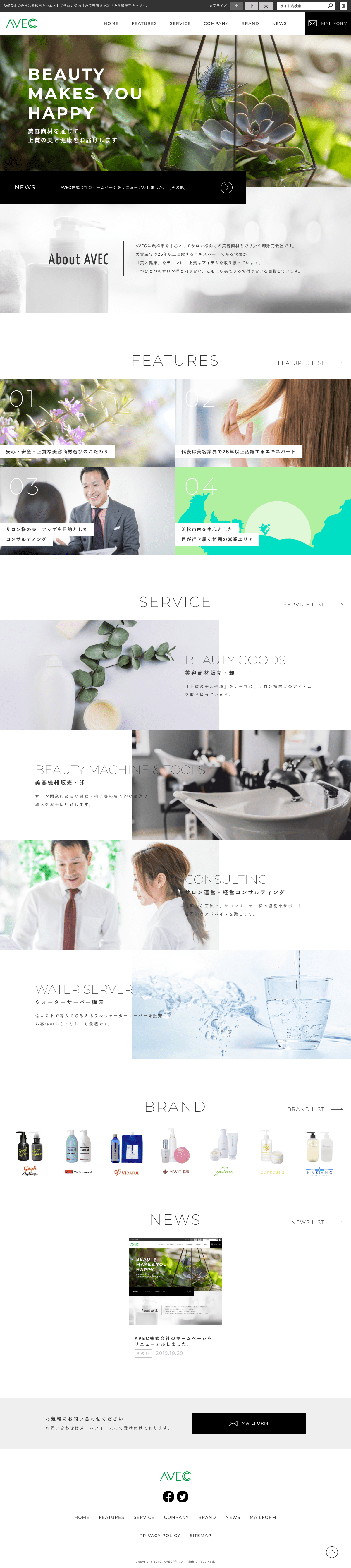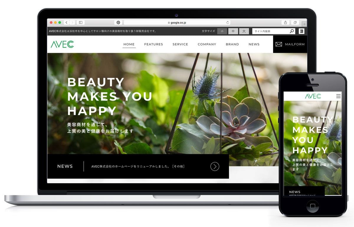 AVEC株式会社様は、浜松市で美容商材・美容機器販売業をしています。弊社は今回サイトリニューアルに伴い、サイトデザイン、HTML/CSSコーディングをお手伝いさせていただきました。