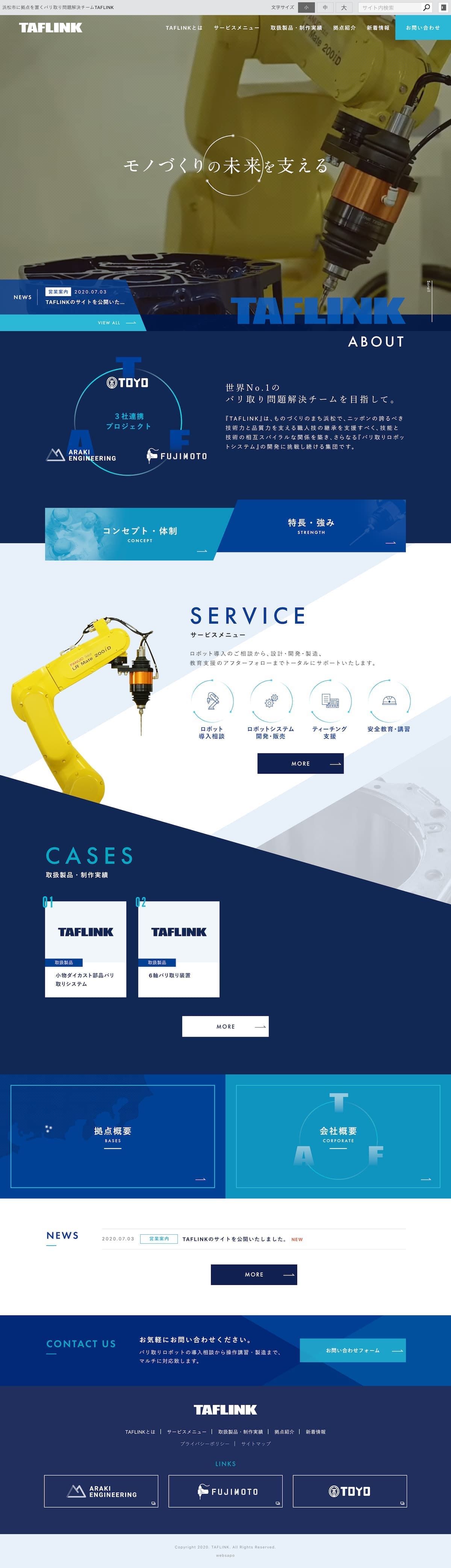 自動車や船外機などに組み込まれる各種ダイカスト部品製造において必ず発生する「バリ取り」という工程において、バリ取りロボットによりバリ取りの問題を解決する3社合同のチーム、TAFLINK様のサイトを制作させていただきました。弊社はサイトデザインのほか、HTML/CSSコーディングをお手伝いさせていただきました。