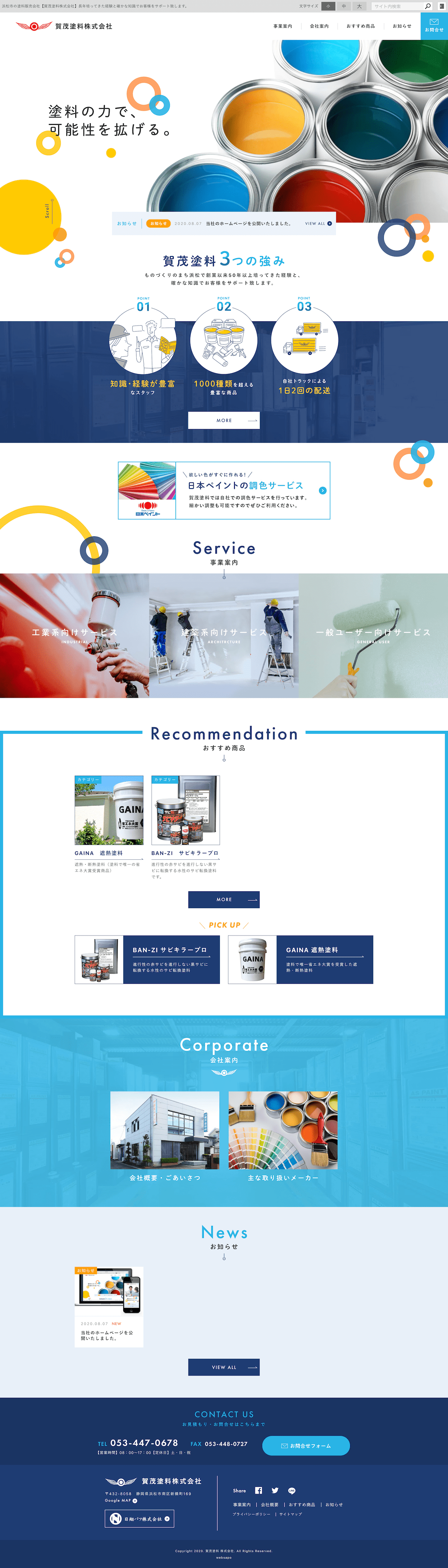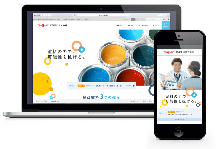 工業系・建築系 どちらにも対応できる塗料と塗装に関する豊富な情報を提供できる塗料商社 賀茂塗料株式会社様のホームページを制作させていただきました。弊社はサイトデザイン、HTML/CSSコーディングをお手伝いさせていただきました。