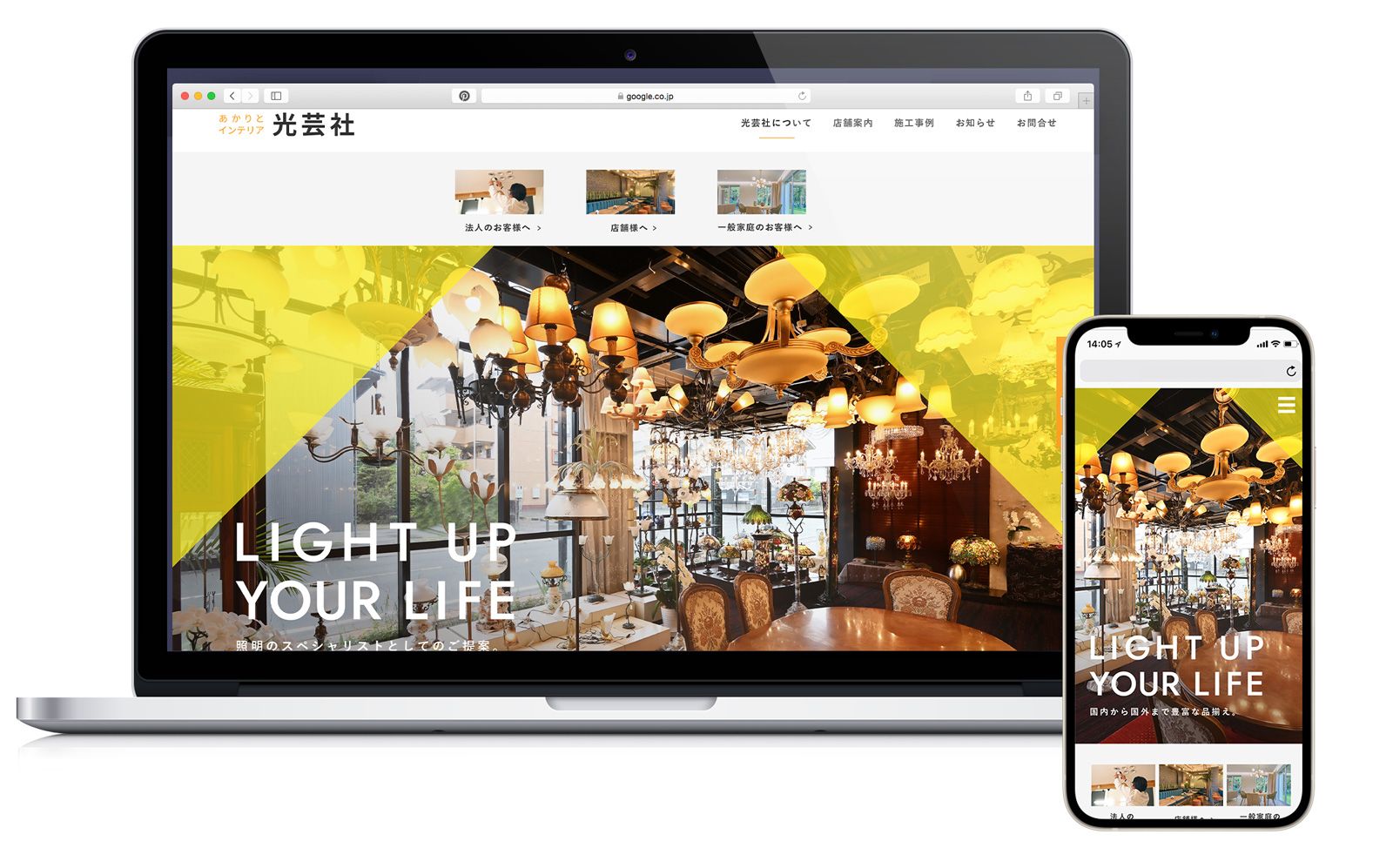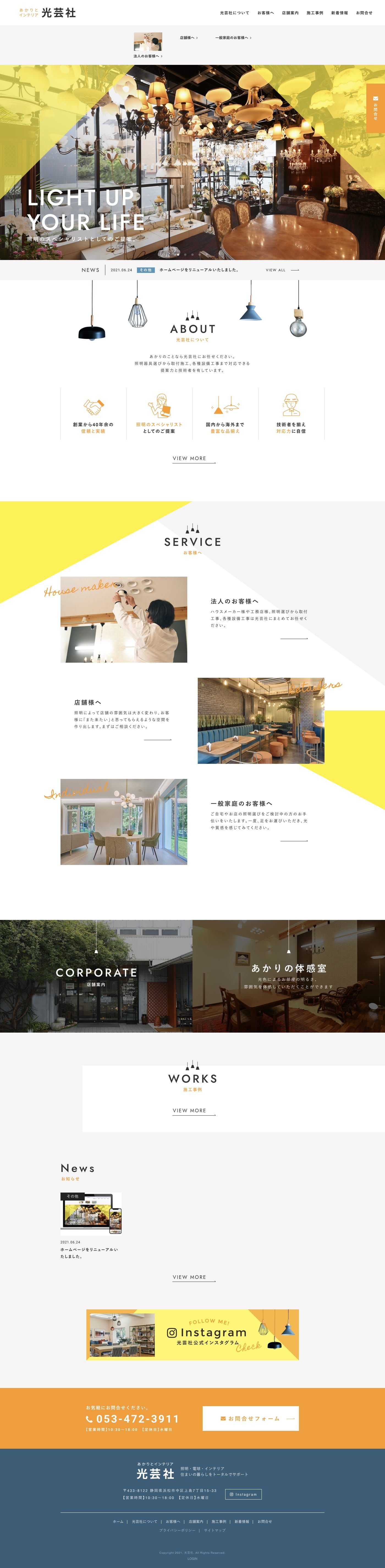 株式会社光芸社様のサイトを制作させていただきました。浜松市の照明の取付施工、設備工事まで対応できる照明・インテリアの専門店です。弊社はサイトデザイン、写真撮影、HTML/CSSコーディングをお手伝いさせていただきました。