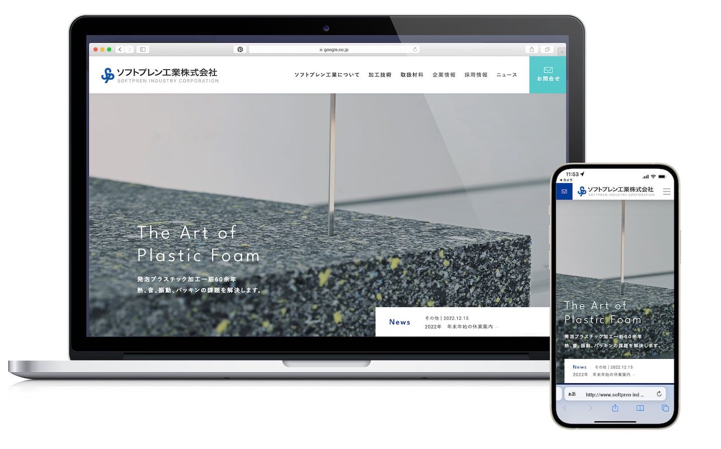 ソフトプレン工業株式会社様のサイトを制作させていただきました。ウレタンフォーム、ポリエチレンフォーム、ゴムスポンジをはじめとした発泡プラスチックの加工を行われている企業様です。弊社は動画撮影・編集、写真撮影、サイトデザイン、HTML/CSSコーディングをお手伝いさせていただきました。