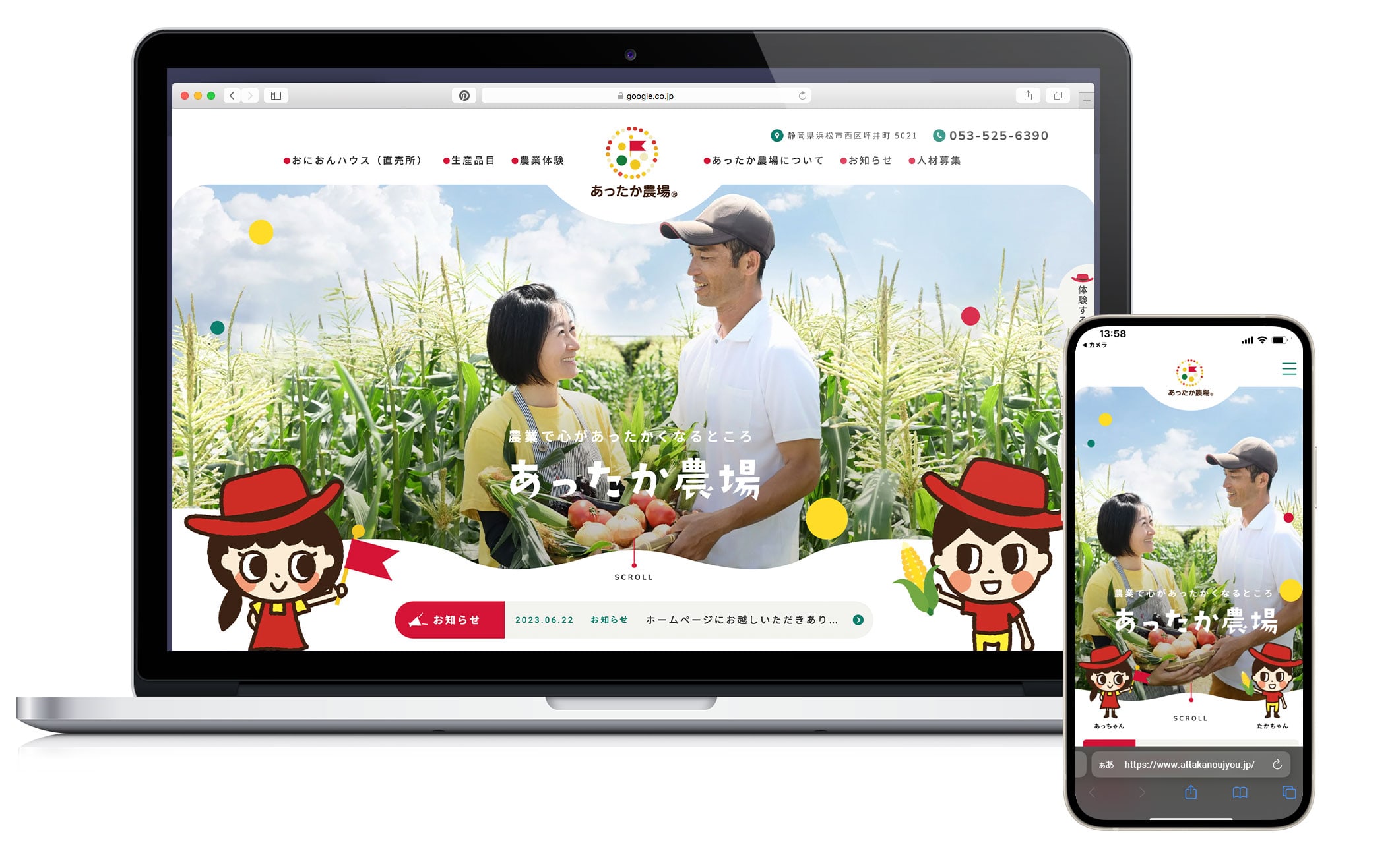 株式会社あったか農場様のサイトを制作させていただきました。浜松にてとれたて野菜の直売所を設置し、農業体験などを開催している企業様です。弊社はサイトデザイン、HTML/CSSコーディングをお手伝いさせていただきました。