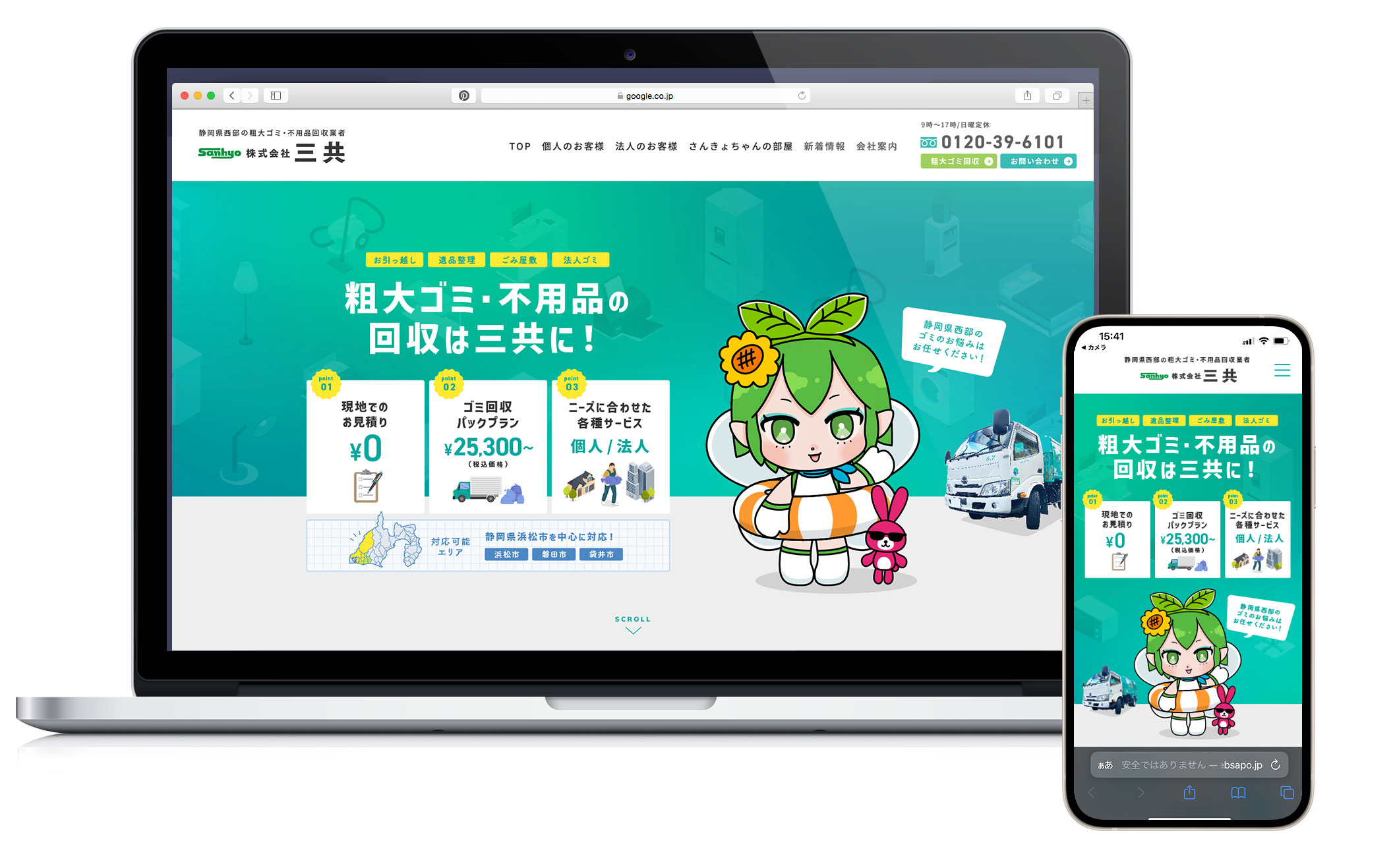 株式会社三共様のサイトを制作させていただきました。三共様は、静岡県西部で産業廃棄物の収集運搬、不用品回収、ゴミ屋敷、遺品整理、消火器のリサイクル、ダストボックスの販売を行なっていらっしゃる企業様です。弊社はサイトデザインとHTML/CSSコーディングをお手伝いさせていただきました。