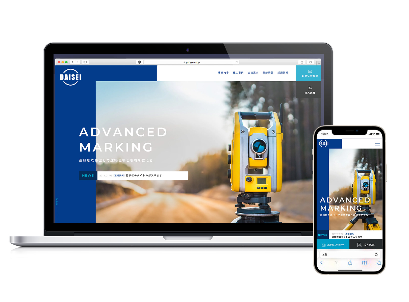 株式会社大成技建様のサイトを制作させていただきました。 株式会社大成技建様は、建築工事の進行に欠かせない「墨出し」で一般住宅や公共施設の工事現場を支え、地域の皆さまの暮らしづくりをお手伝いしていらっしゃる企業様です。 弊社はサイトデザインとHTML/CSSコーディングをお手伝いさせていただきました。