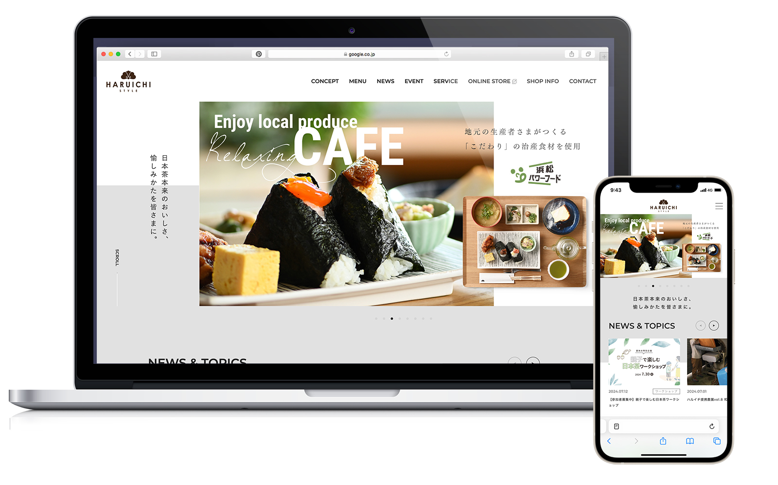 ハルイチ スタイル(HARUICHI STYLE)様のサイトを制作させていただきました。浜松市の地産を堪能出来る和カフェで、ランチやティータイムに和菓子やお茶を楽しめます。サイトリニューアルに伴い、弊社はサイトデザインと写真撮影、HTML/CSSコーディングをお手伝いさせていただきました。