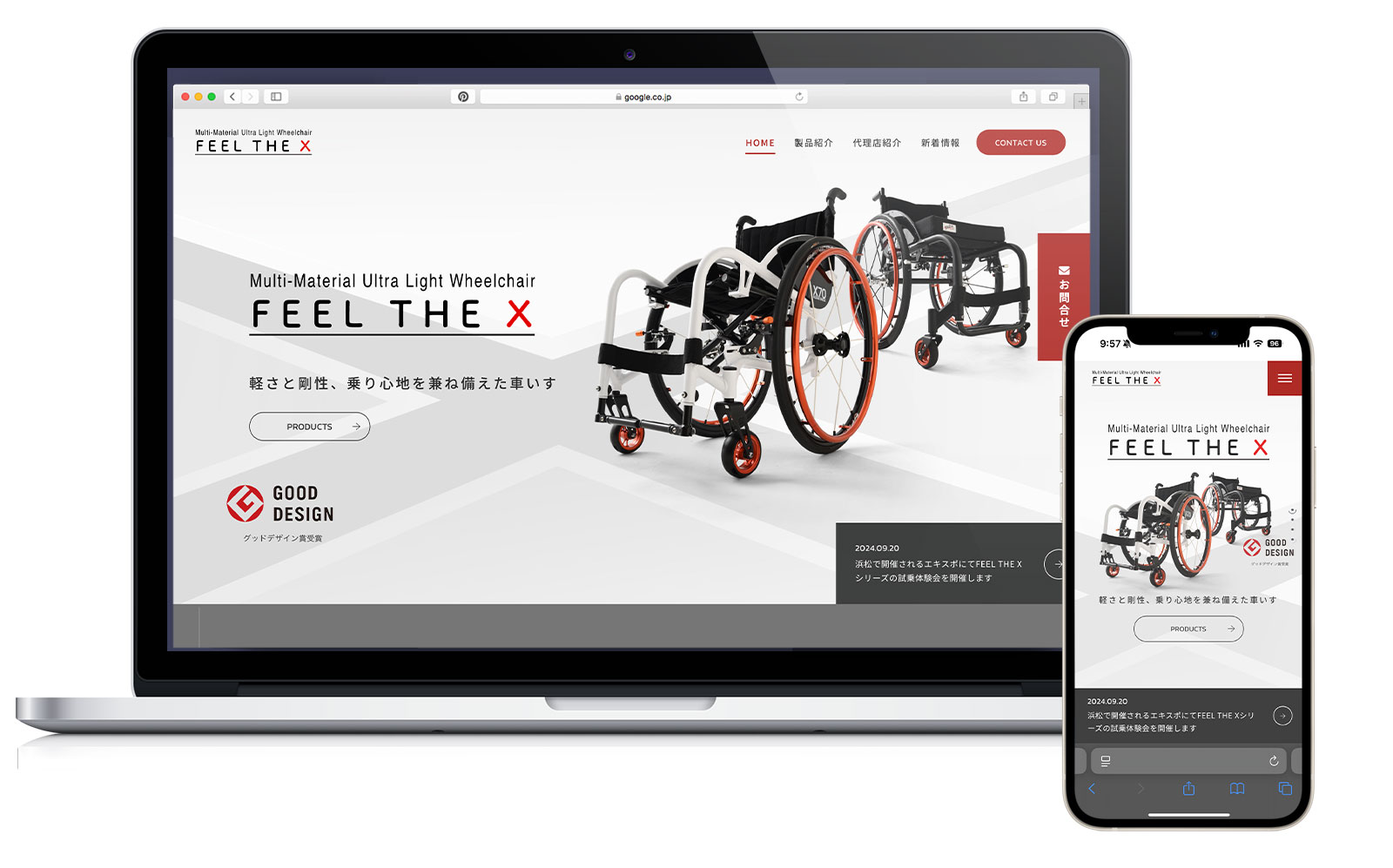 「FEEL THE X」は、自動車部品加工や金属加工を強みとしている橋本エンジニアリング様の超軽量車いすブランドです。弊社は写真撮影、サイトデザインとHTML/CSSコーディングをお手伝いさせていただきました。