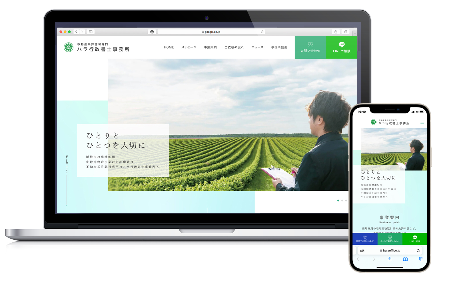 ハラ行政書士事務所様は、浜松市の農地転用の手続きを行っている不動産系許認可専門行政書士事務所様です。 弊社はサイトデザインとHTML/CSSコーディングをお手伝いさせていただきました。
