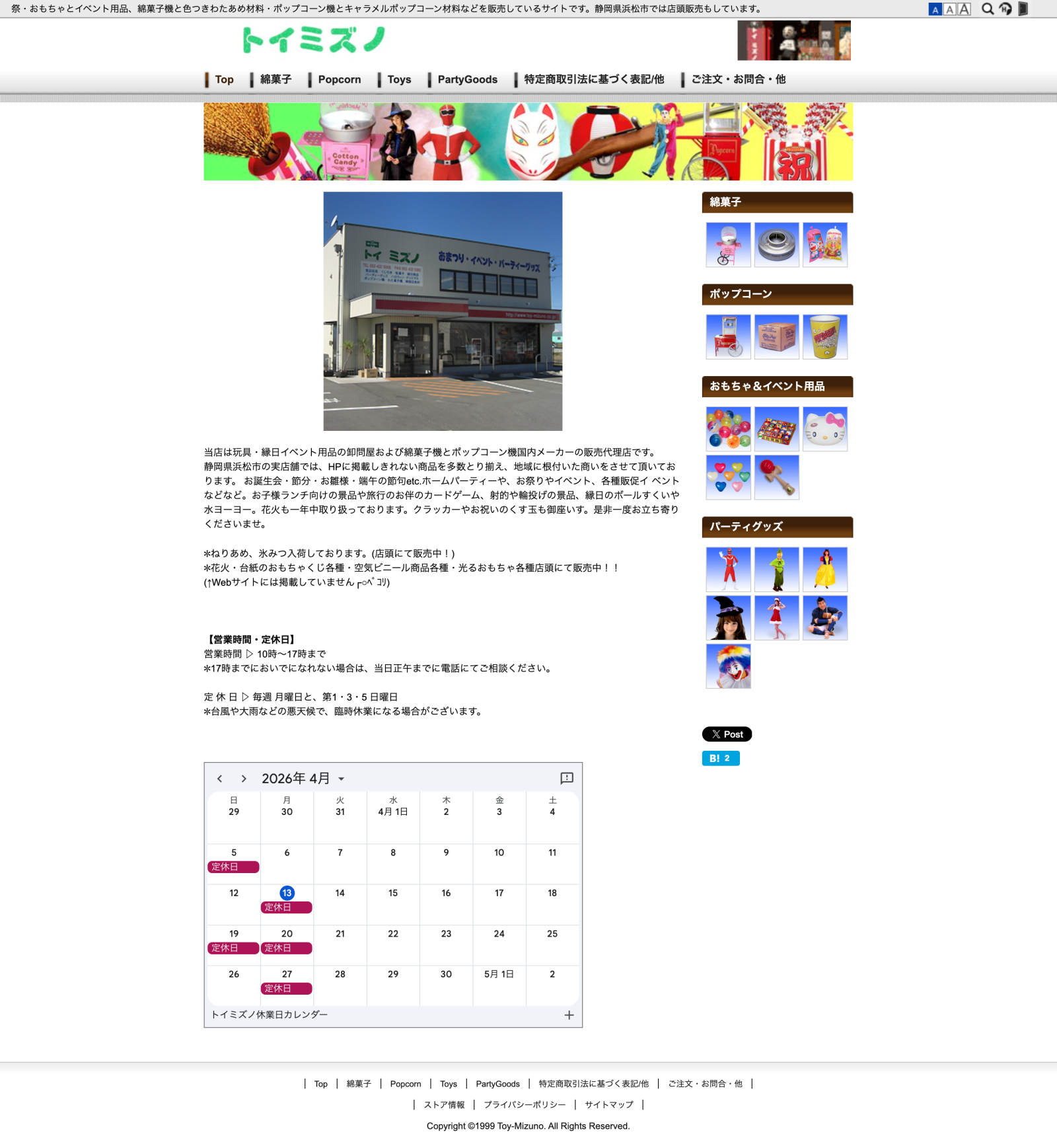 有限会社トイミズノ様は、静岡県浜松市で実店舗を構えて営業しております玩具・イベント用商品の卸問屋です。綿菓子機・ポップコーン機につきましては販売代理店でもございます。店舗ではHPに掲載されていない商品も多数取扱がございますので、お客様のご来店を快いお待ち申し上げます。