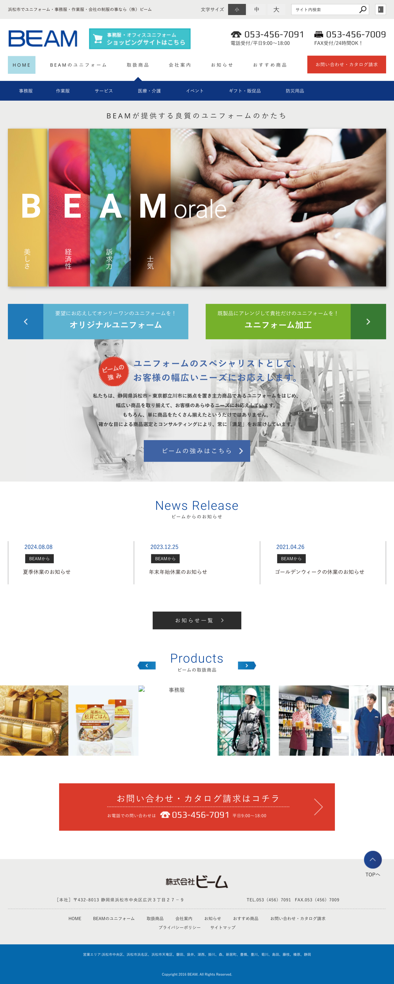 静岡県西部で地域に密着し制服や事務服などを販売している株式会社ビーム様仕事着などのユニフォームはもちろん、お歳暮やお中元といった記念品・ギフト品、防災用品なども取り扱っており、様々な角度からお客様企業の営業活動・団体活動をサポートしています。コーポレートカラーの 青 を基調とし、明るい雰囲気が全面に出る様なサイトに仕上がりました。http://www.beam-uniform.co.jp/