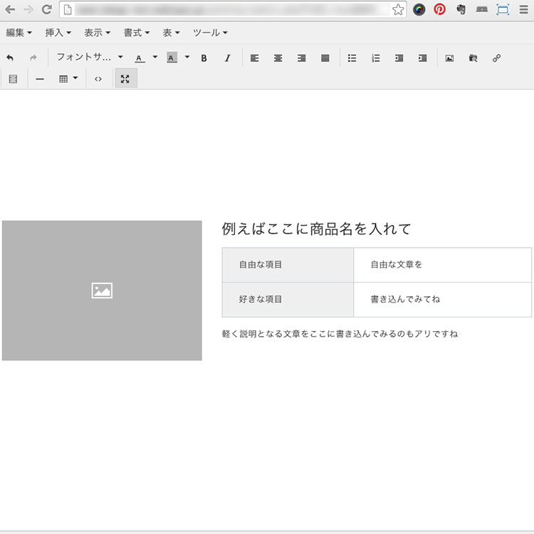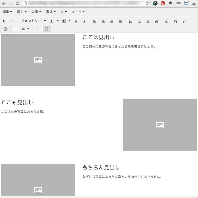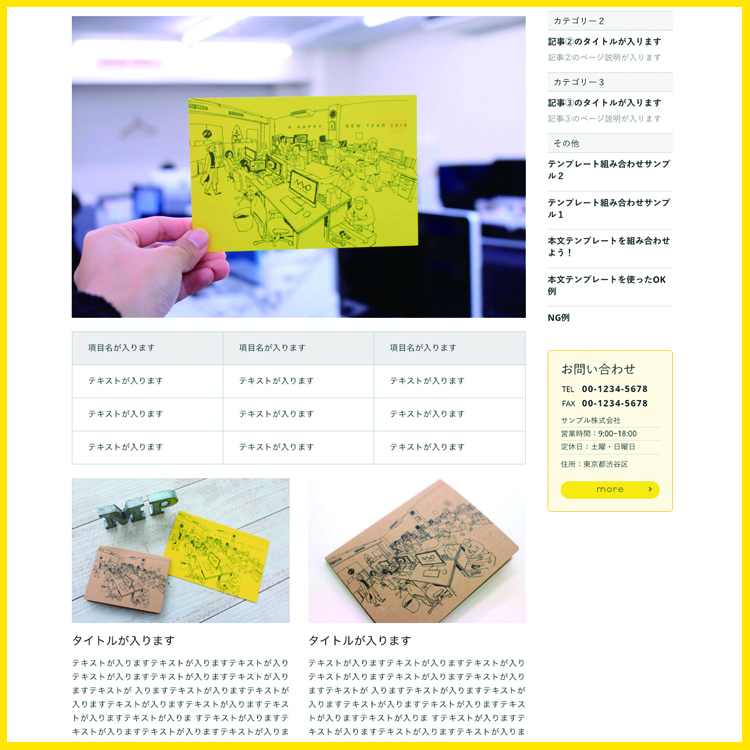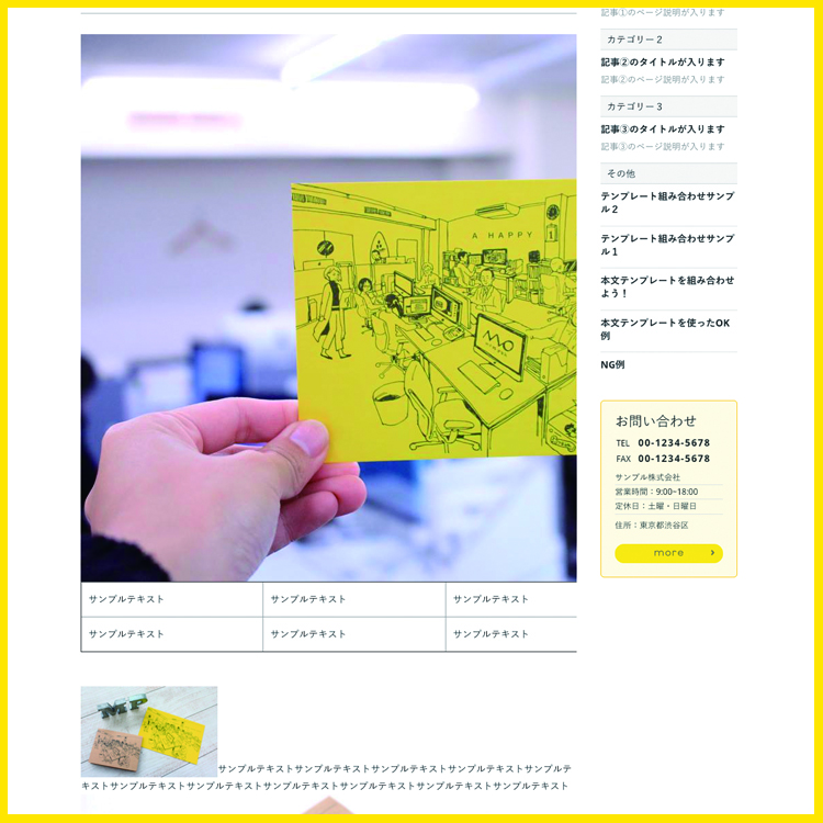 本文に表を作り、その中に画像を載せるという作業も、ページや画像の幅をきちんと把握していないと表示した時にレイアウトが崩れてしまいます。色々な本文テンプレートを組み合わせることで、画像と文章だけで難なくキレイなレイアウトの記事が完成します。