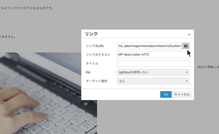 リンク先URLの右にあるアイコンをクリックするとファイルマネージャーが開かれるので、先ほどアップロードしたPDFファイルを指定します。