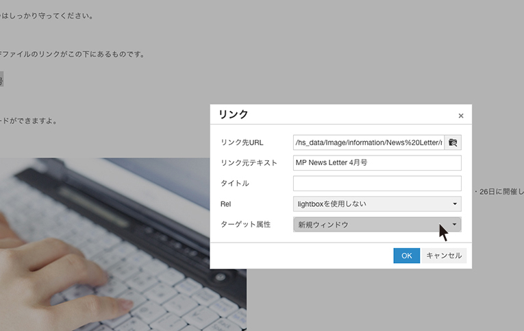 リンクの「ターゲット属性」を「新規ウインドウ」にすれば完了です。これは、開いているタブとは別のタブでPDFを開くようにする設定で、閲覧ページとPDFファイルのページが別になることにより、PDFファイルを閉じてもサイトを引き続き閲覧出来ます。